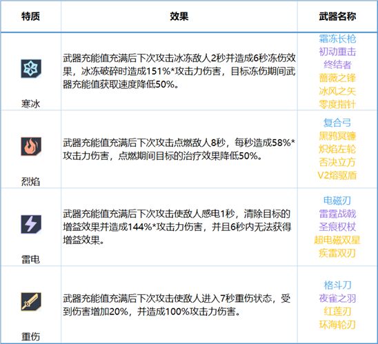 不同的武器,拥有的武器特质不同。武器特质分为四种,分别是“寒冰”(冰)、“烈焰”(火)、“雷电”(电)三种元素攻击,以及“重伤”这一种无属性攻击。