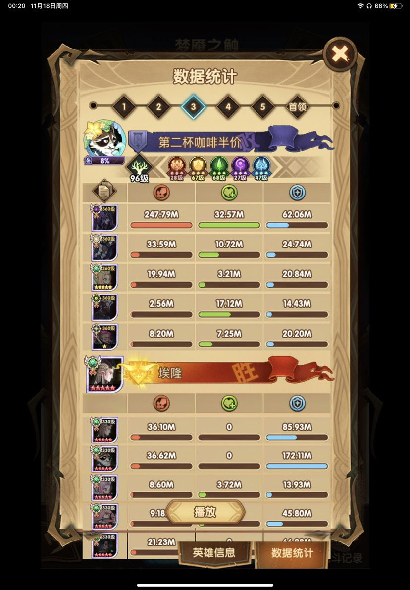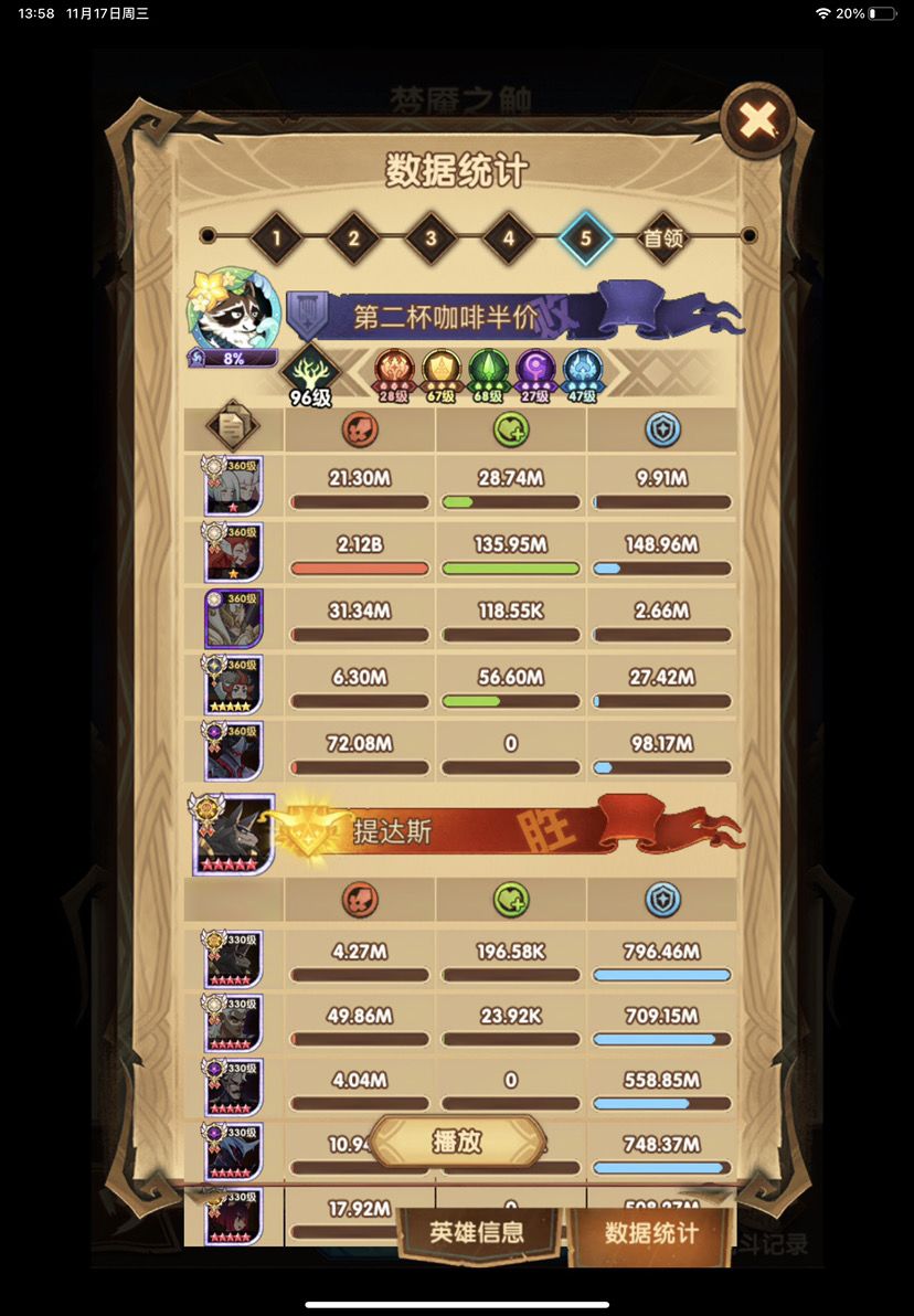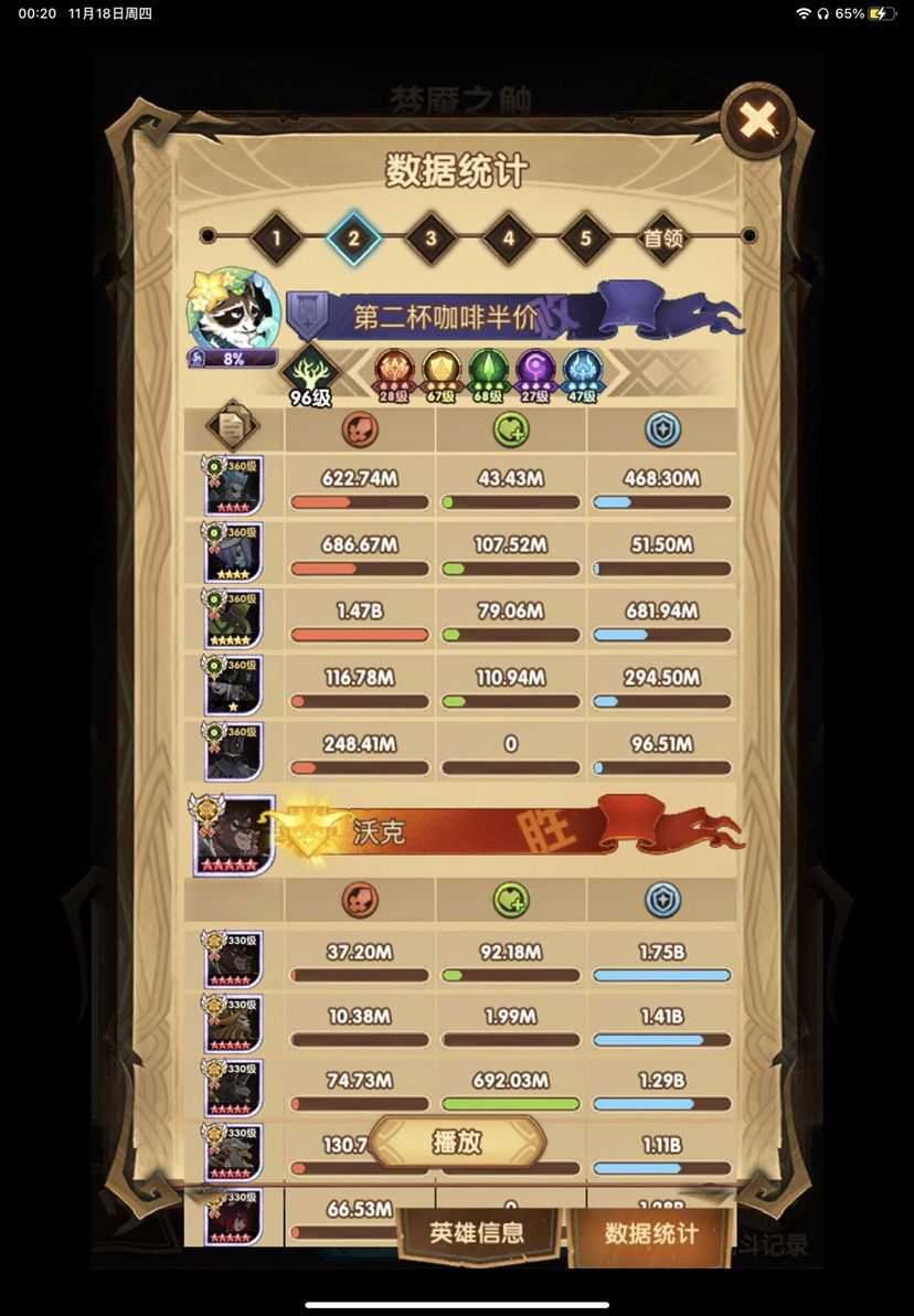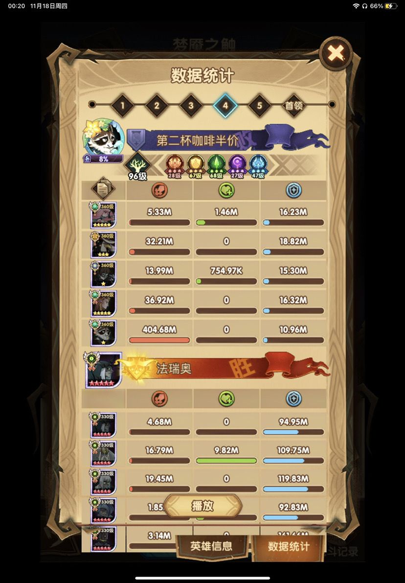 第四队其实用的是周三分享的绿意队 但是小浣熊刻印等级低于第一个号 伤害就少了400M-500M 只能打出一半伤害400-500M 小浣熊刻印44就能打出800-1B了
