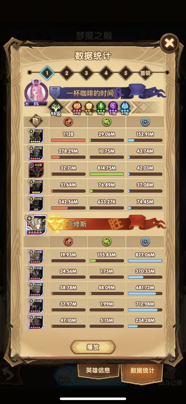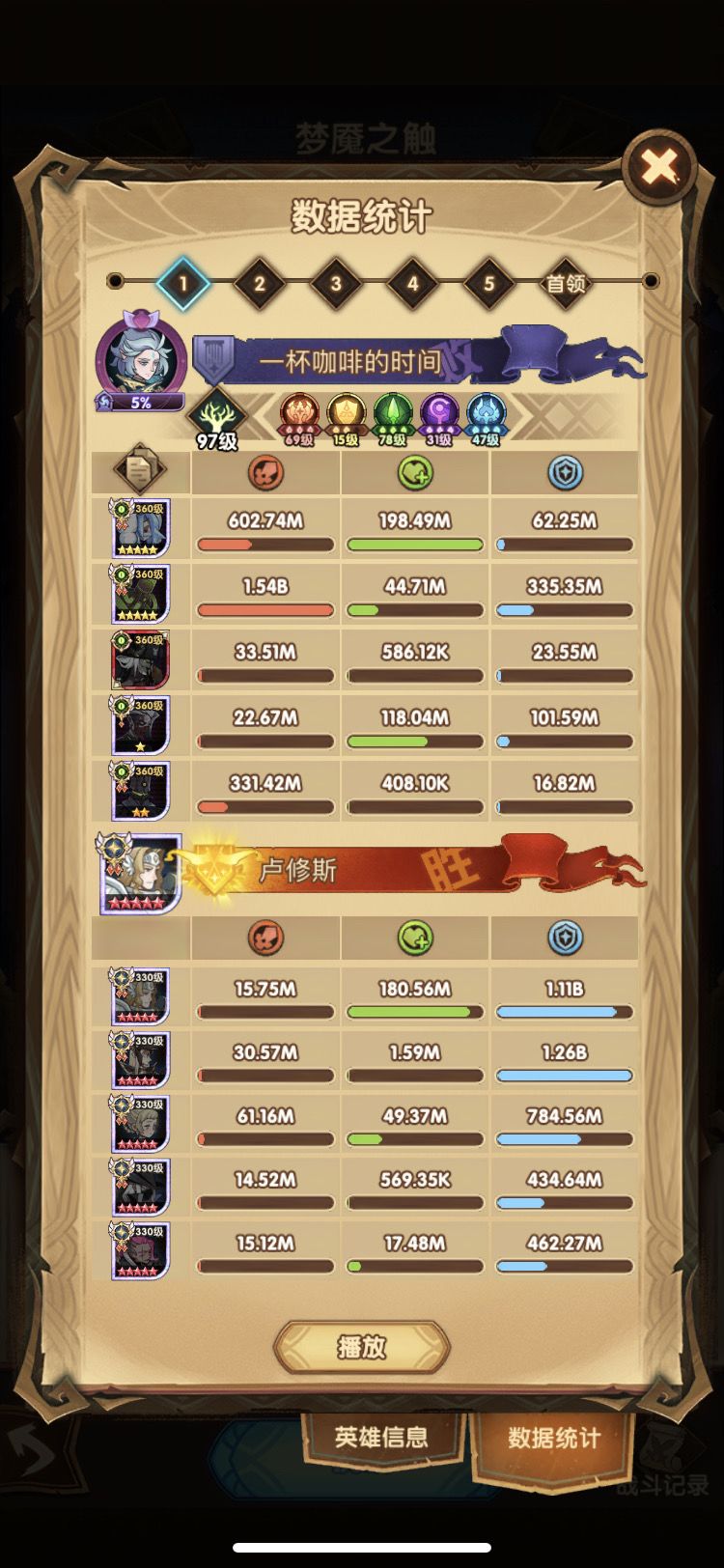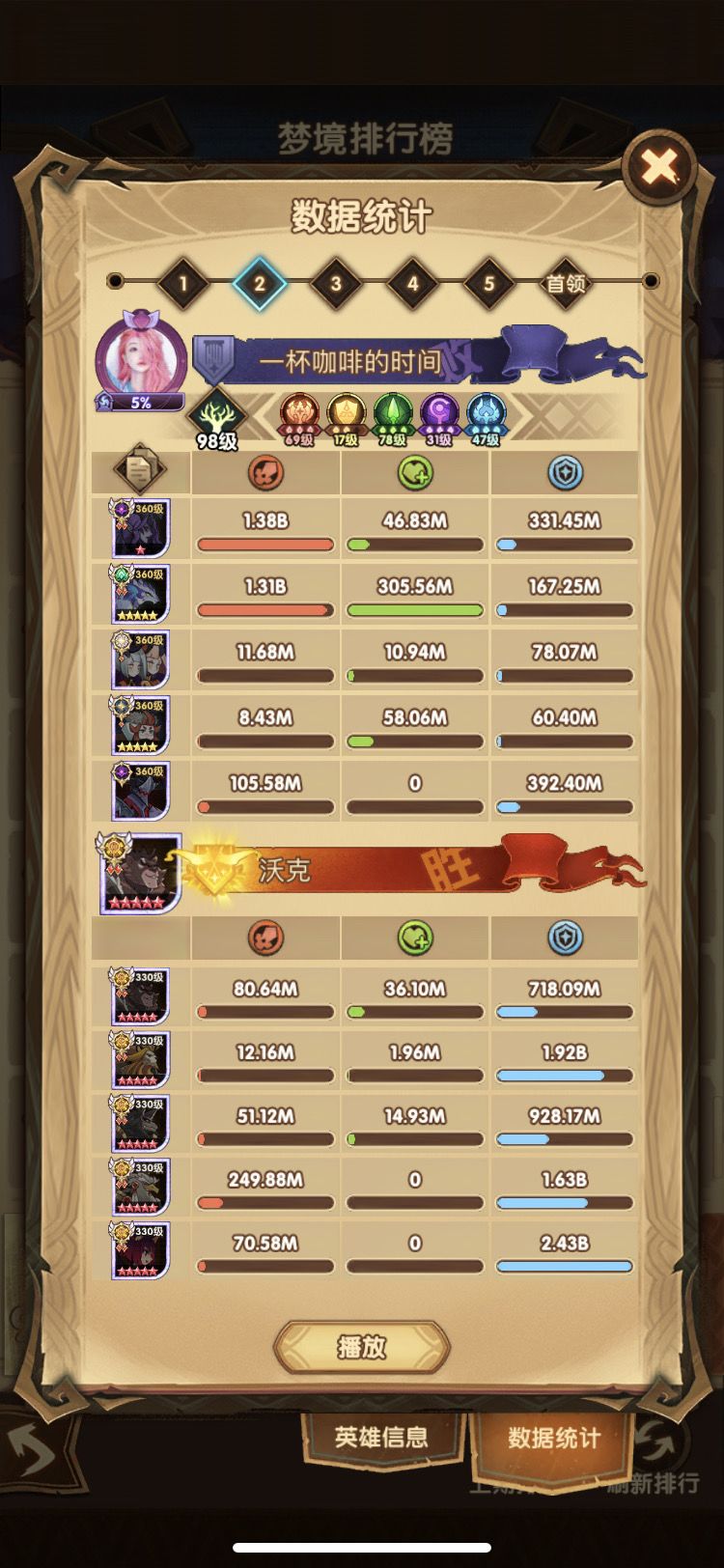 第四队其实用的是周三分享的绿意队 但是小浣熊刻印等级低于第一个号 伤害就少了400M-500M 只能打出一半伤害400-500M 小浣熊刻印44就能打出800-1B了