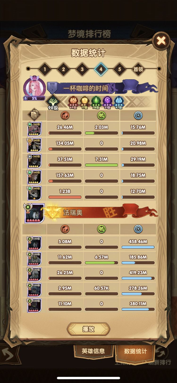 第五队 其实有新半神和9红小羊 高配凤凰就不要像我这样打 但是我都没有 我的凤凰只有红色。没办法 只能放弃boss队 把双子给这队 借一手高配凤凰 2.2B