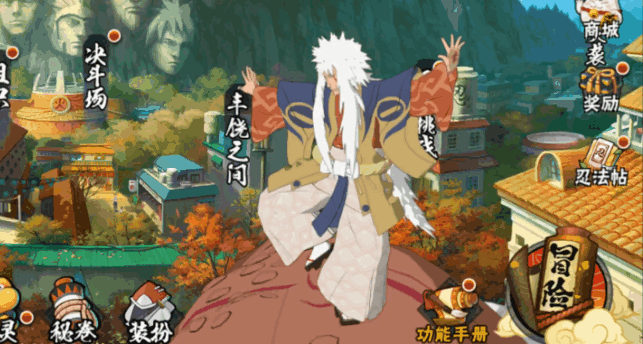 自来也可吸取自然能量开启仙人模式,同时召唤深作与志麻发动魔幻·蛤蟆临唱攻击敌人,最后以仙法·乱发狮子之术终结敌人。
