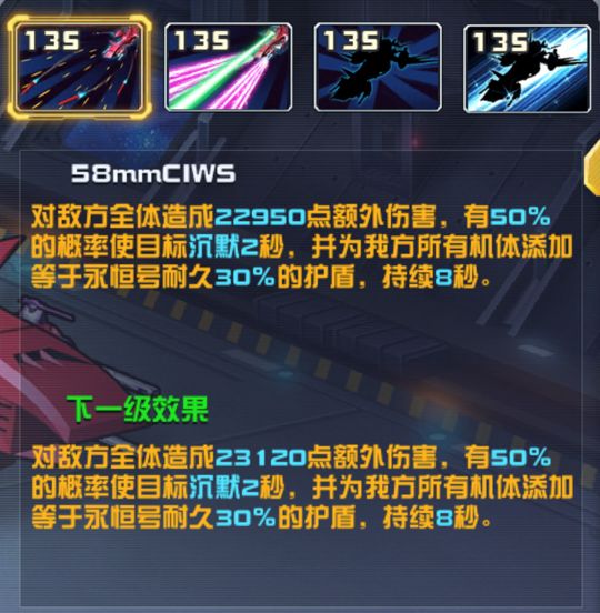 对全体目标造成22950点额外伤害,有50%的概率使目标沉默2秒,并为我方所有机体添加等于永恒号耐久30%的护盾,持续8秒。