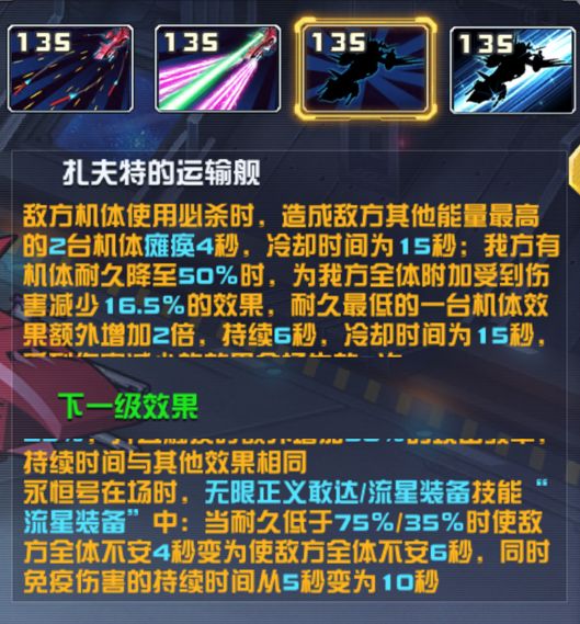 技能:【扎夫特的运输舰】(135级效果)敌方机体使用必杀时,造成敌方其他能量最高的2台机体瘫痪4秒,冷却时间为15秒;我方有机体降低至50%时,为我方全体附加受到伤害减少16.5%的效果,耐久最低的一台机体效果额外增加2倍,持续6秒,冷却时间为15秒,受到伤害减少的效果全场生效3次。