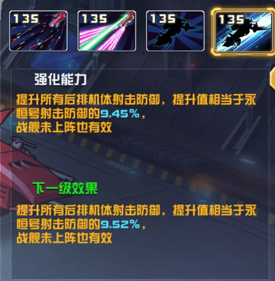 技能:【强化能力】(135级效果)提升所有后排机体射击防御,提升值相当于永恒号射击防御的9.45%,战舰未上阵也有效。