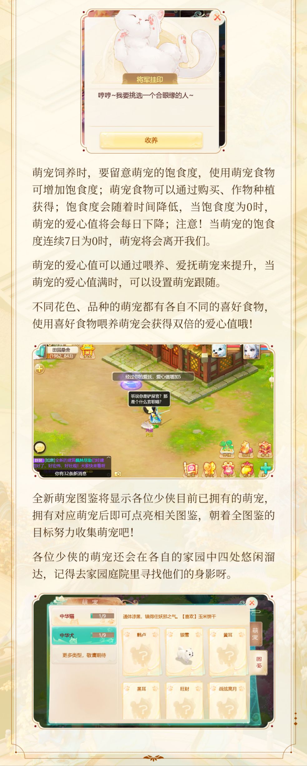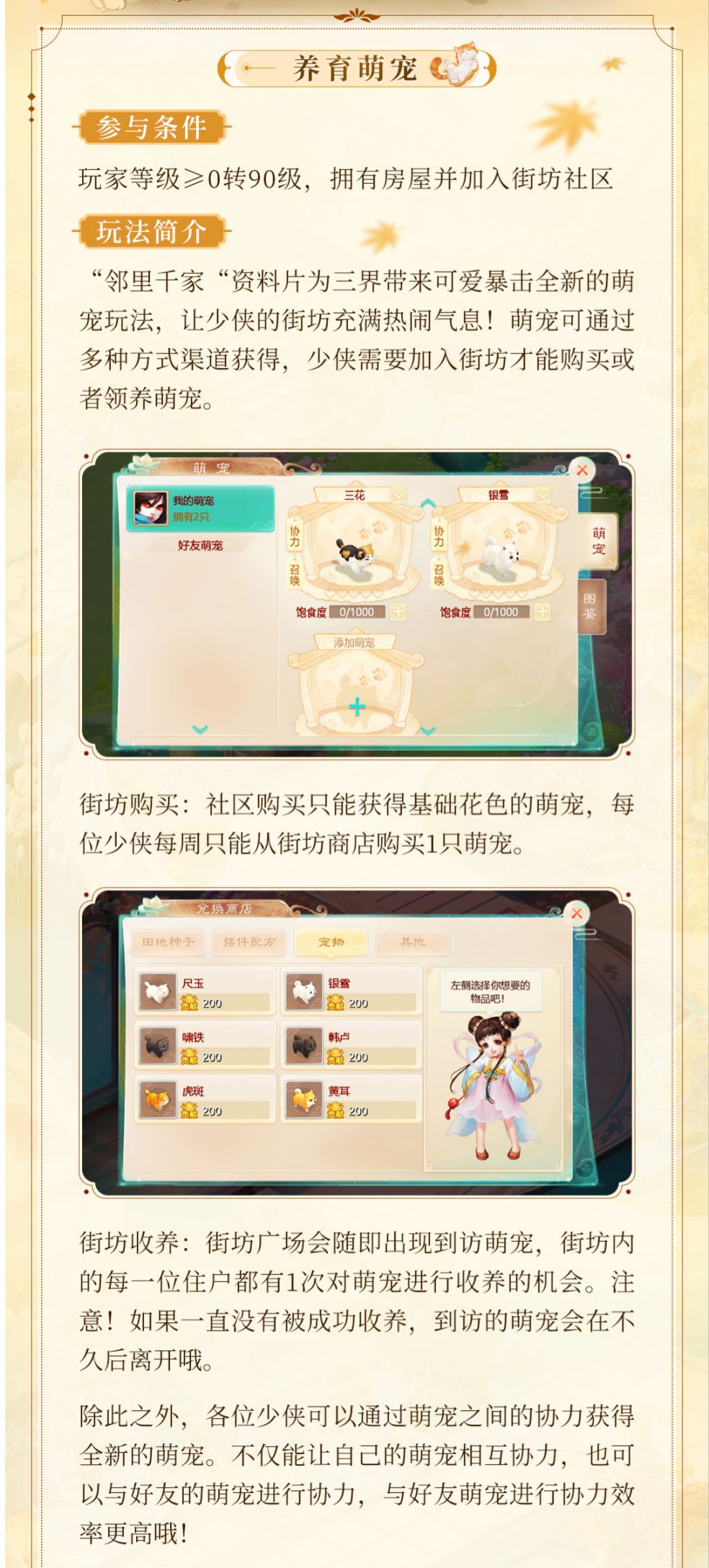 掌管街坊社区的小兔仙君带来了不同的品种、花色的小萌物们,此刻正在等待少侠们的精心照顾~少侠们可以通过社区购买、社区收养、好友协力获得萌宠并进行培养。