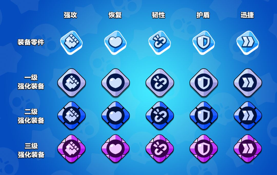 强化装备的推出,将进一步拓展游戏内容,提供更多样的战略搭配。现推出的强化装备一共有5种类型,每种类型都能给英雄提供不同的被动技能。强化装备可在英雄界面进行制造和升级,需要花费两种全新资源:装备零件和装备碎片。这两种资源可以从乱斗宝箱中开出,也可以通过商店(普通商店或战队商店)获取。