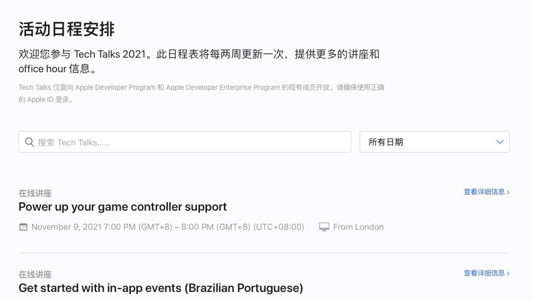 在 2021/10/25至2021/12/17 期间苹果推出了Tech Talk系列线上讲座,其内容涵盖了审核、技术、设计等多方面。讲座主题每两周更新一次,开发者们可以根据自身需求进行线上报名,通过审核后,到点进入直播间即可观看!