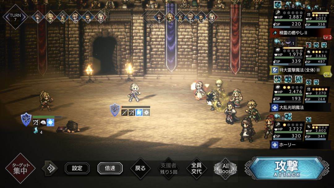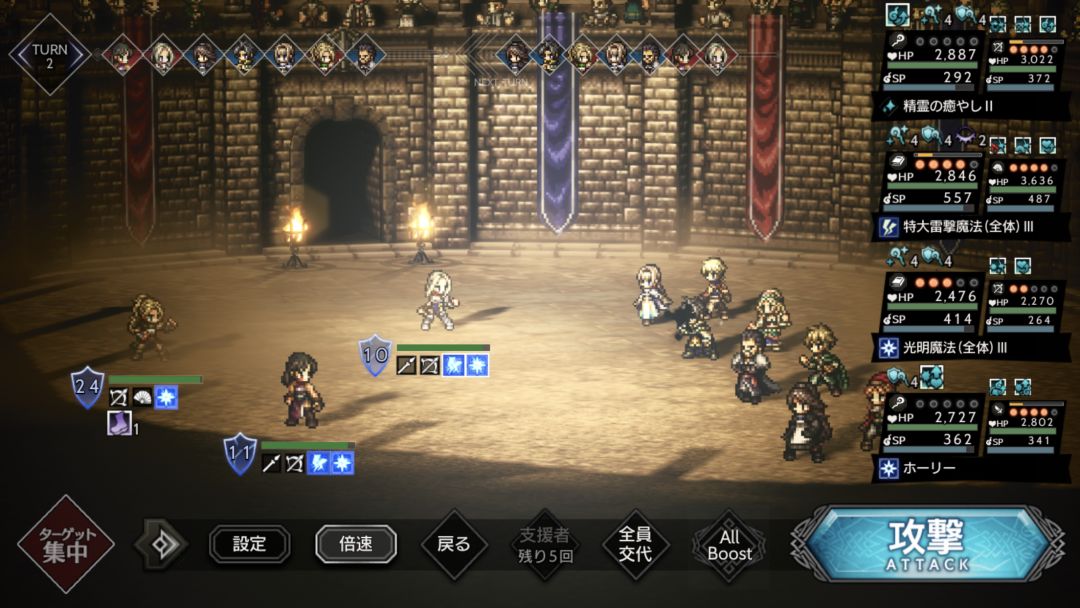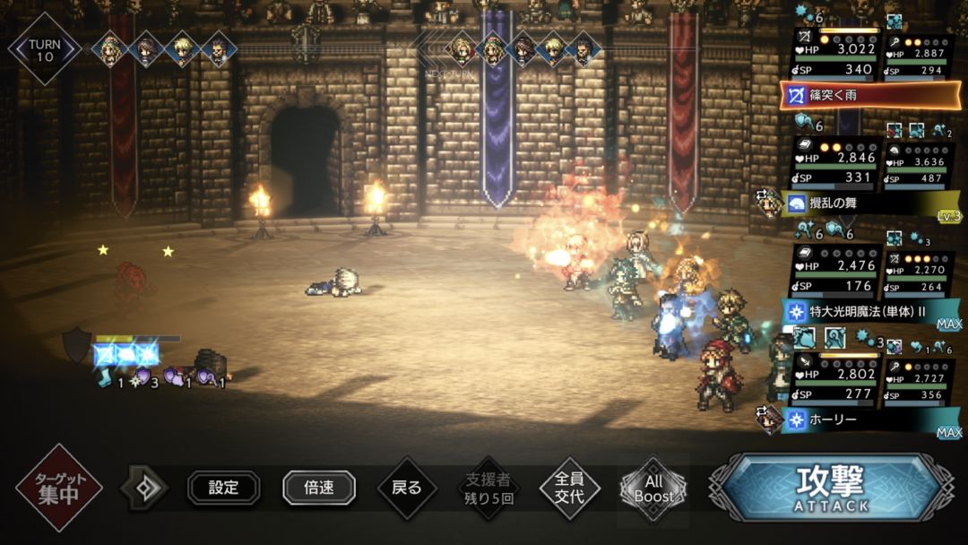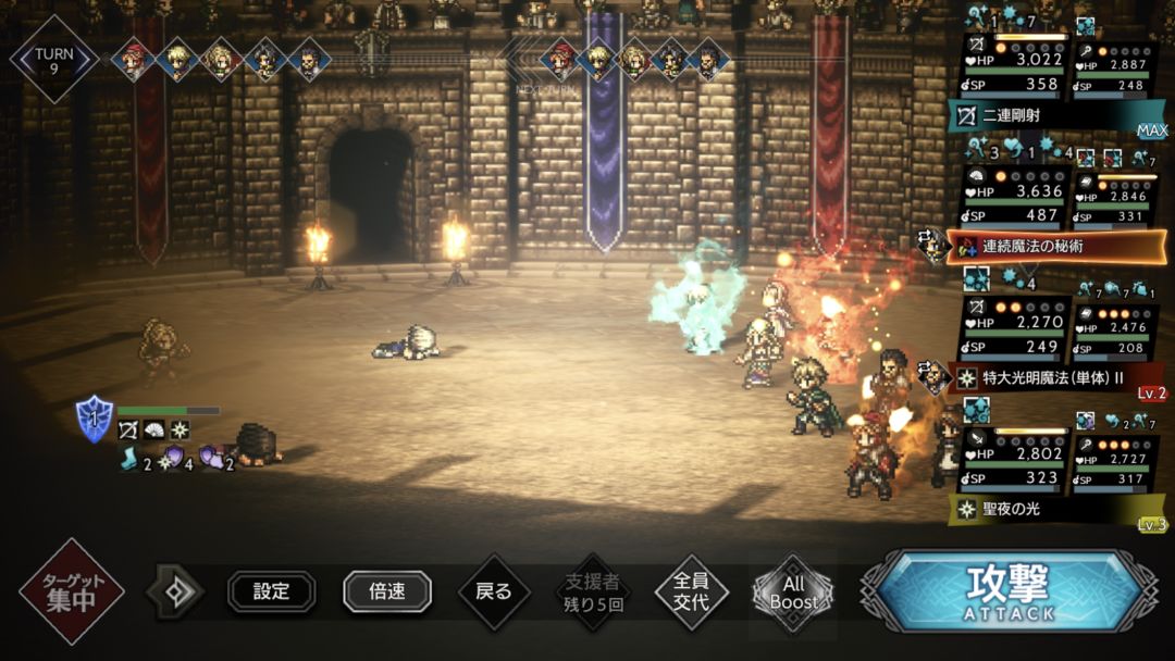 Turn1:(从上往下)神官1的技能升级后,可以像舞者一样靠吃bp延迟buff时间。神官2满bp技能可以前卫全体持续恢复。俩学者(雷光)全体魔法,猎人1获得持续恢复buff退后。注意神官1速度要比boss慢,学者1比学者2快。