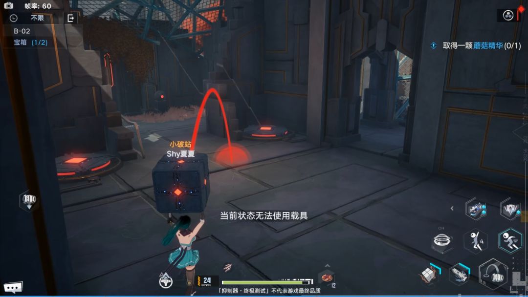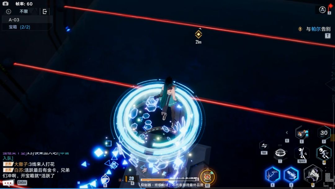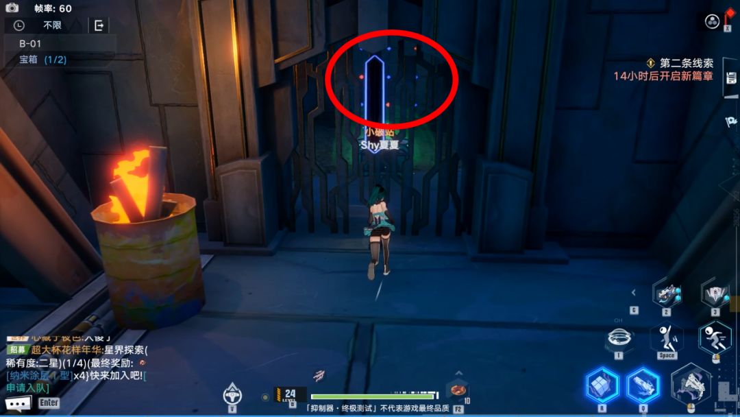 宝箱二:接下来杀怪,利用手炮继续前进。到了下图位置,如果血多,就直接瞬闪过去拿宝箱,如果血少,就等手炮CD,用手炮挡住激光通过。