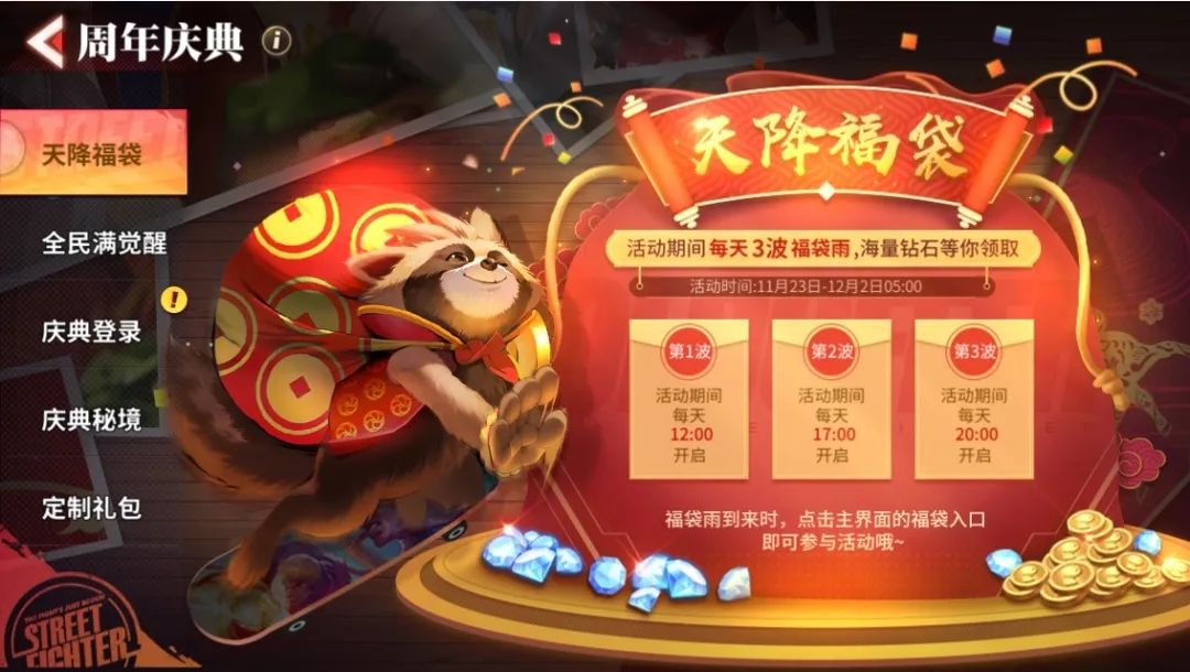 *具体奖励最终以游戏内上线为准福利六:天降福袋➤活动时间11月23日5:00-12月2日5:00活动期间,每天12:00、17:00、20:00增加一次天降福袋活动次数,次日5:00重置。在主界面点击活动入口图标进入天降福袋活动,点击屏幕中下落福袋,即可领取福袋对应的奖励,多领多得哦~