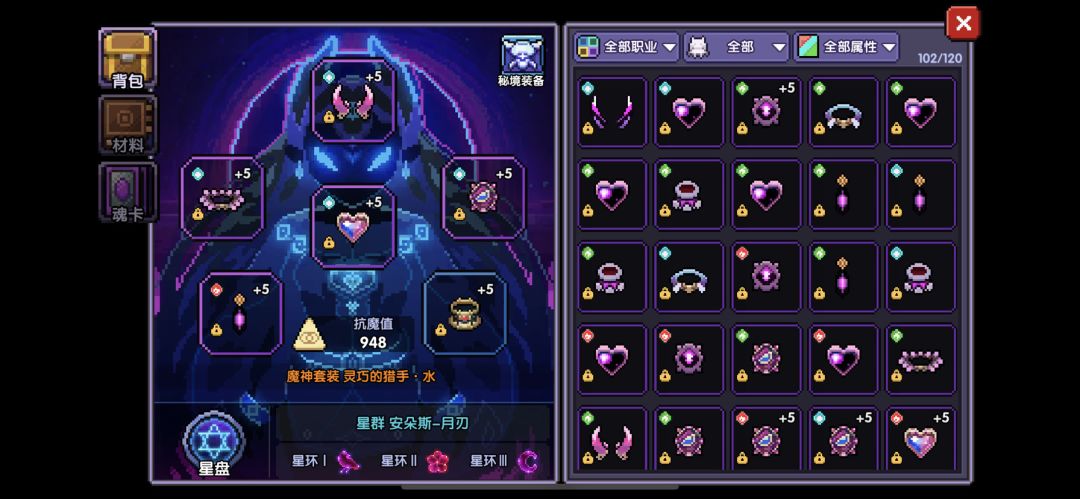 水系4件套。头部,核心,饰品都选择元素穿透。因为2阶魔女的头部核心都没有元素穿透,但目前自身元素穿透愈高,伤害也愈高,建议整体到达3500以上,再慢慢考虑换2阶魔装。