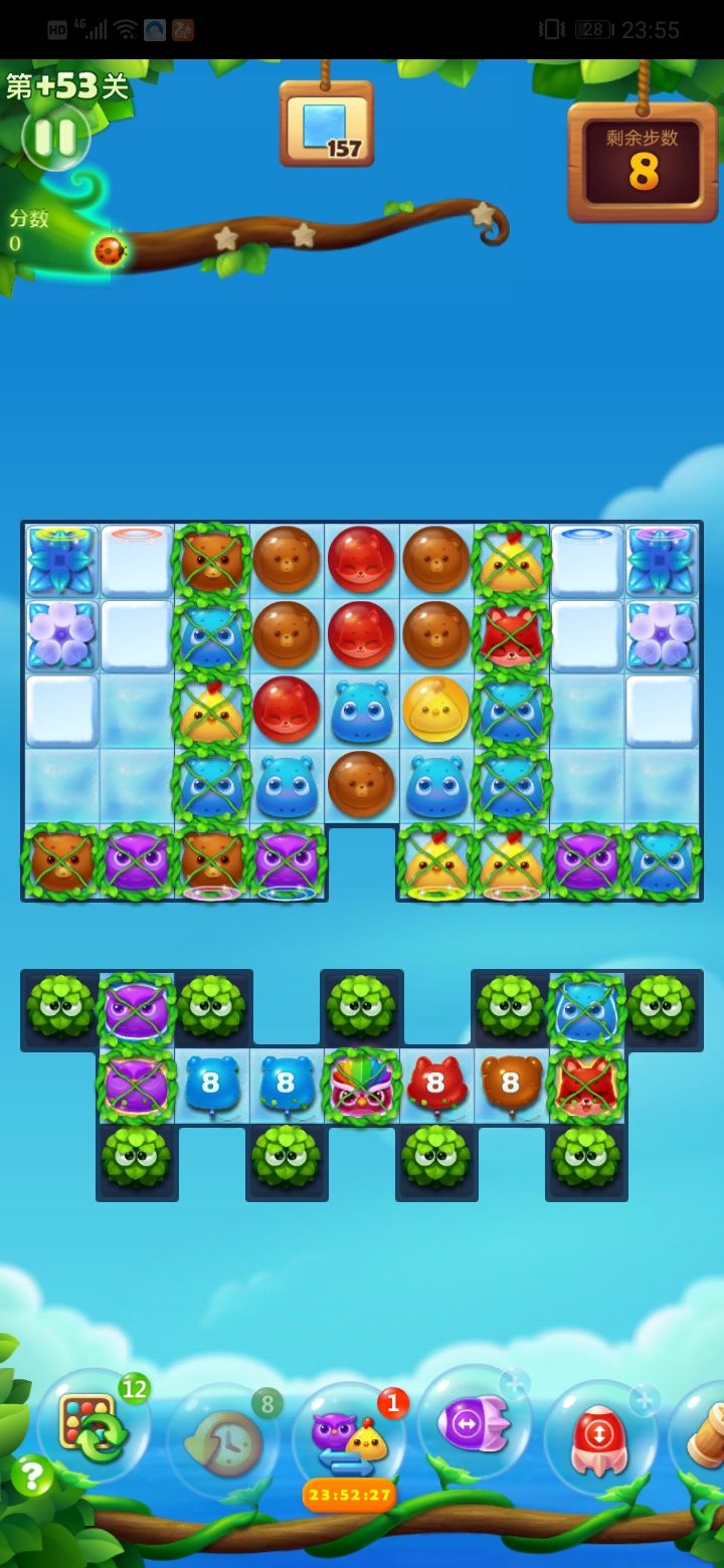 3.开局找同色,在地图下半区左右两侧中,被树藤包裹的小动物需同色,若发现左右两边均没有同色,直接推倒重来!无限精力多的是,大方一点又如何!此开局方法对于手里道具不多的乐友较为适用,本关难点在于树藤及地图上半区,具体细节见图六图七,祝闯关顺利!