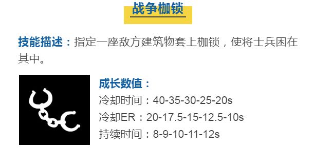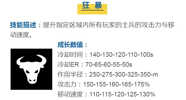 适合用于进攻的技能,注意这个技能没有作用的时间限制,而且作用范围也挺大的,非常适合多线出征的士兵,让他们分头进攻才能最大限度的发挥这个技能的优势。