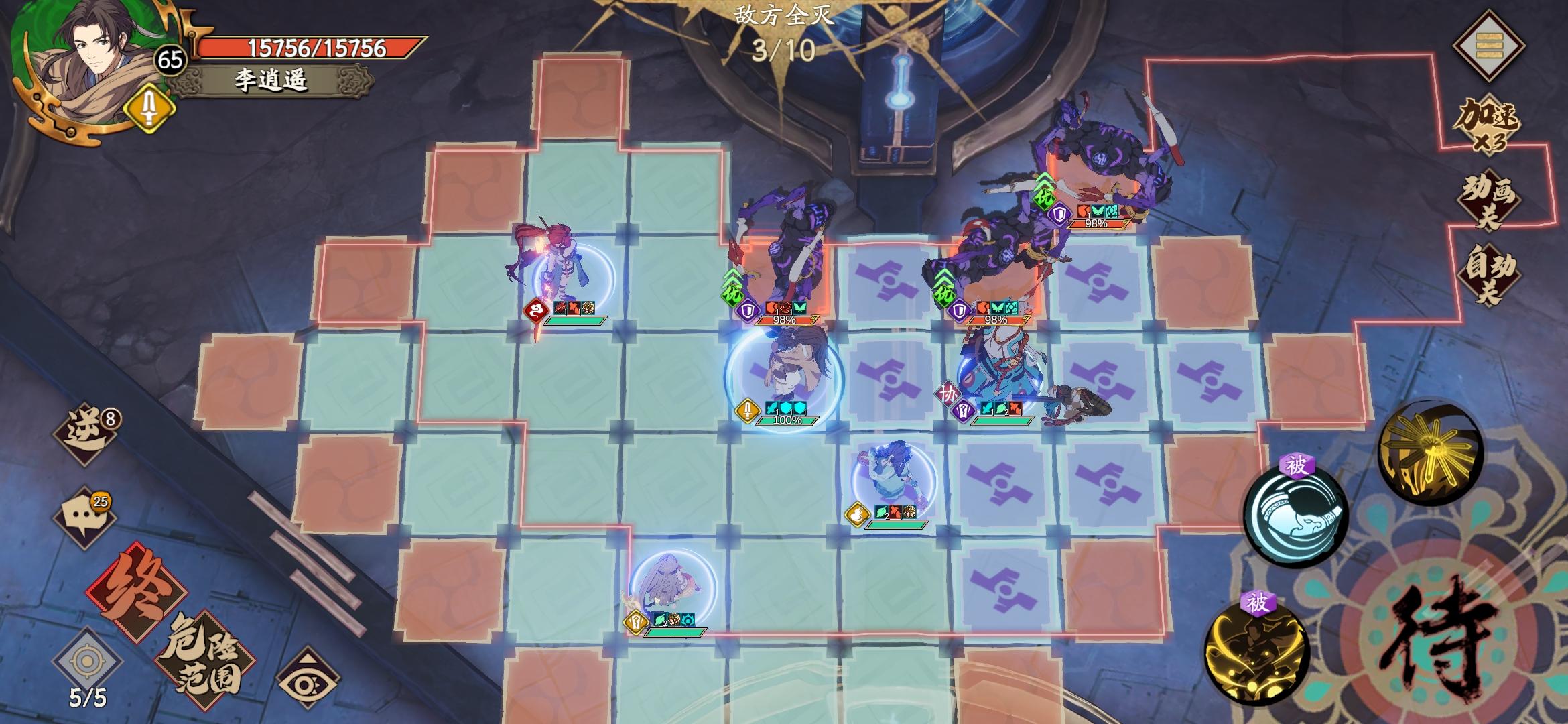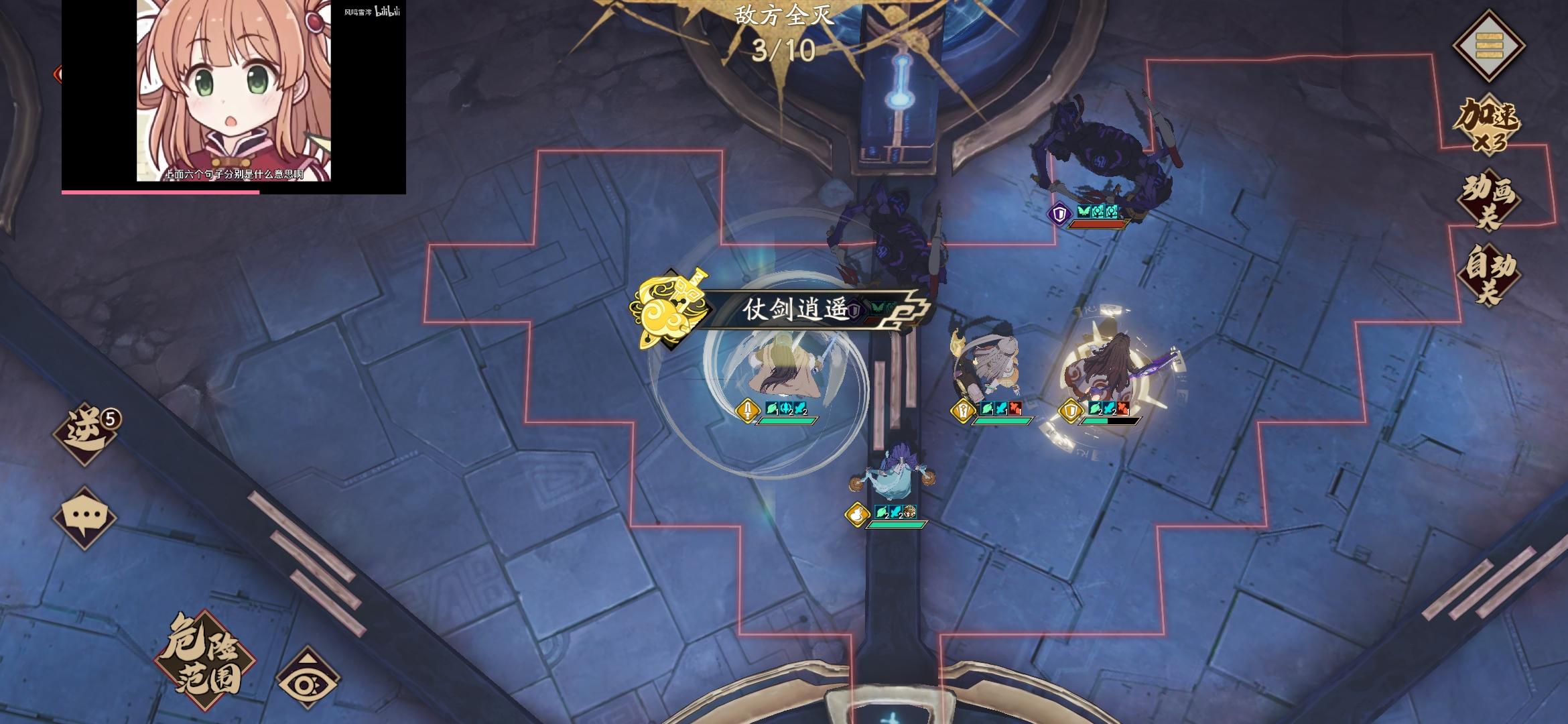 先冥皇强化逍遥(小僵尸走位到冥皇右上角,第一回合吸收依次伤害还卡位,重中之重!)之后逍遥平A(上乱神疲弱)然后艾艾补伤害之后曹姐姐buff挂左边这只怪不要挂残血,因为一发技能足够收头之后走位到图上位置(这只怪会A曹,闪避的效果就出来了)封妈回春没错,被动正好恢复逍遥触发被动