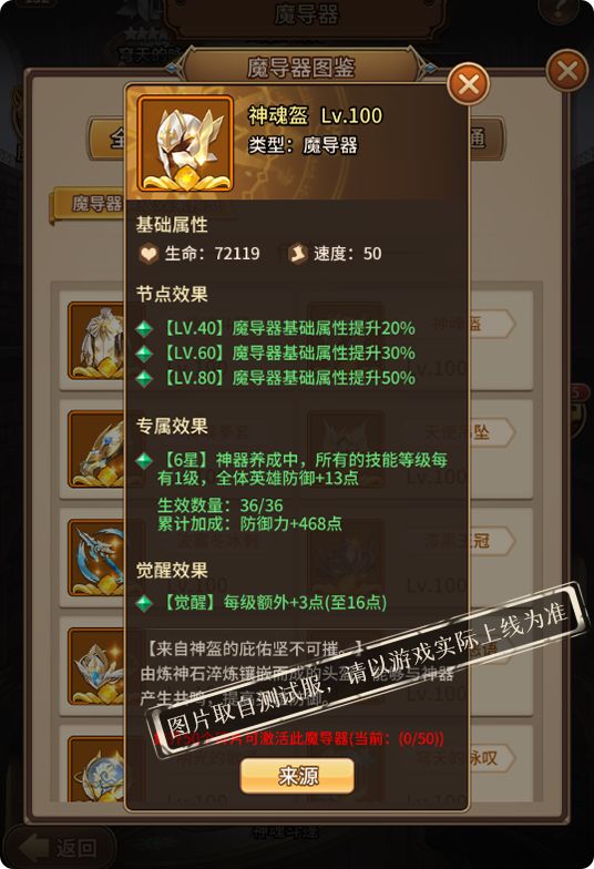 【神魂盔】:神器技能等级越高,则全体英雄防御提升值越高;