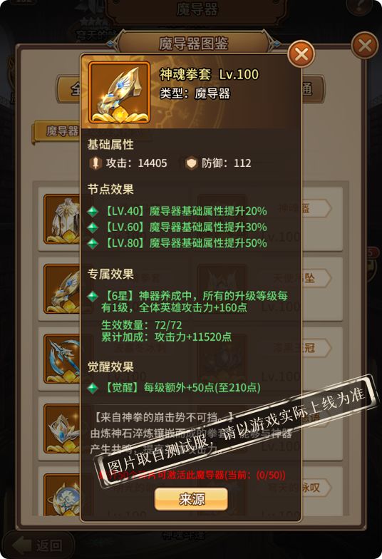 【神魂拳套】:神器等级越高,则全体英雄攻击力提升值越高;