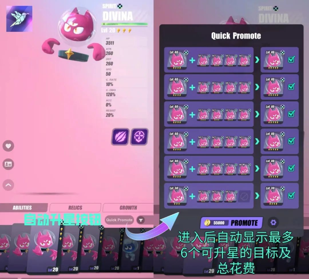 自动升星页面的入口及快速升星界面: