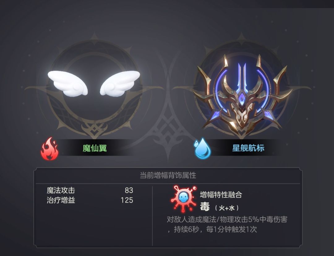玩家可以选择一个或两个背饰放在增幅位置中,根据背饰元素和品质激活增幅属性和增幅特技,单个背饰增幅可以给玩家提供稀有属性,双背饰融合增幅可以给玩家带来强力特技,放置第二个背饰需要玩家将背饰突破完2阶好啦~今天的妮娅小课堂就告一段落了,我们下次再见!