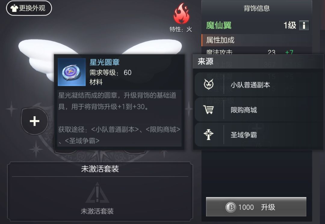 升级背饰的等级,等级提升后获得背饰属性成长,在一定的等级节点还可以激活背饰外观或者羽翼(背饰装备)的装备位