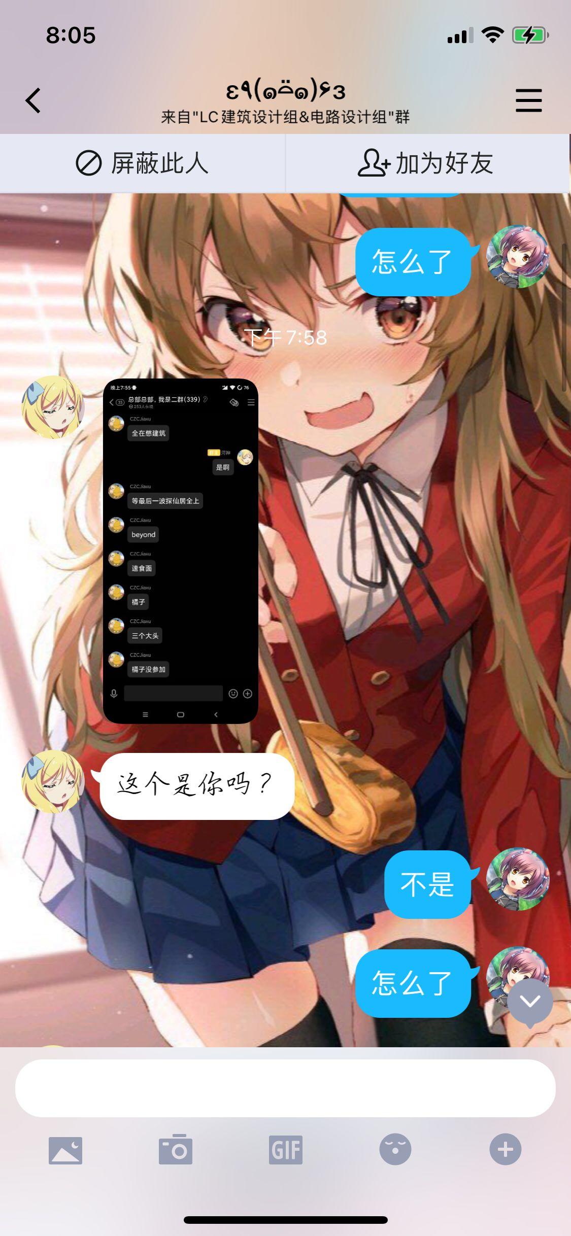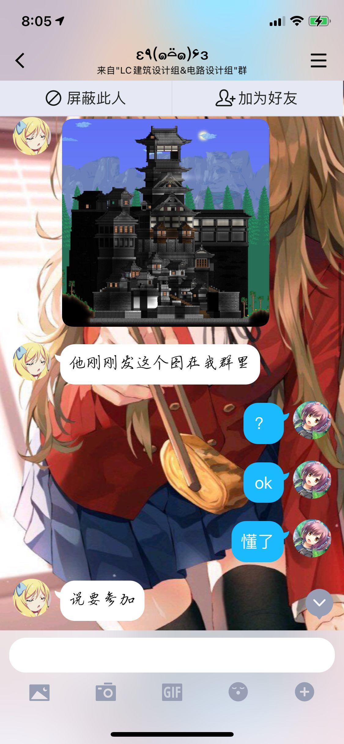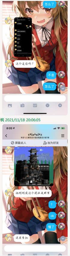 这。。。搁这真假美猴王呢。咱的小懂也没废话哈,直接就把我一个小时左右前在橘建外群发的苇茗天守阁给转发到河神的群里了。我寻思阁下是superman还是何路高人,我自己憋了快两个星期的建筑,帖子都没空写才扣扣搜搜做出来的小作品,兄弟一个小时不到给我抄的明明白白的哈