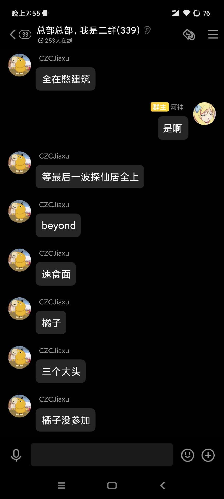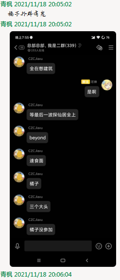 有位hxd(这里就叫他小懂吧,毕竟橘子beyond跟乐乐看起来跟他挺熟的嘛)在河神的群里爆料咱的比赛准备呢。好家伙玩个游戏也能被人八卦,想想好像还挺荣幸的哈;
