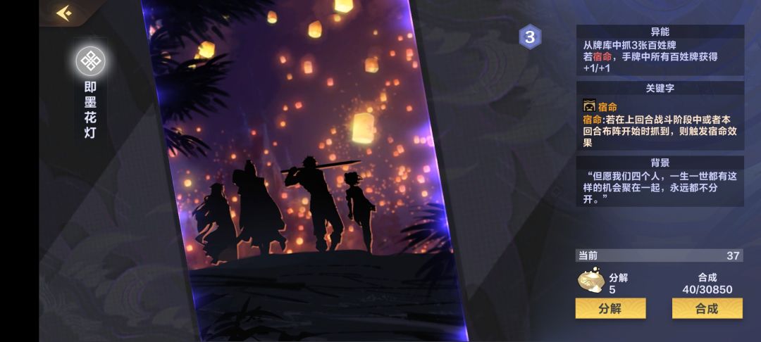 这几张牌也是很关键的,灵光藻玉专门就是为了寻仙即墨花灯这张卡,这样能保证我们不断牌,还能让手牌百姓全部+1+1