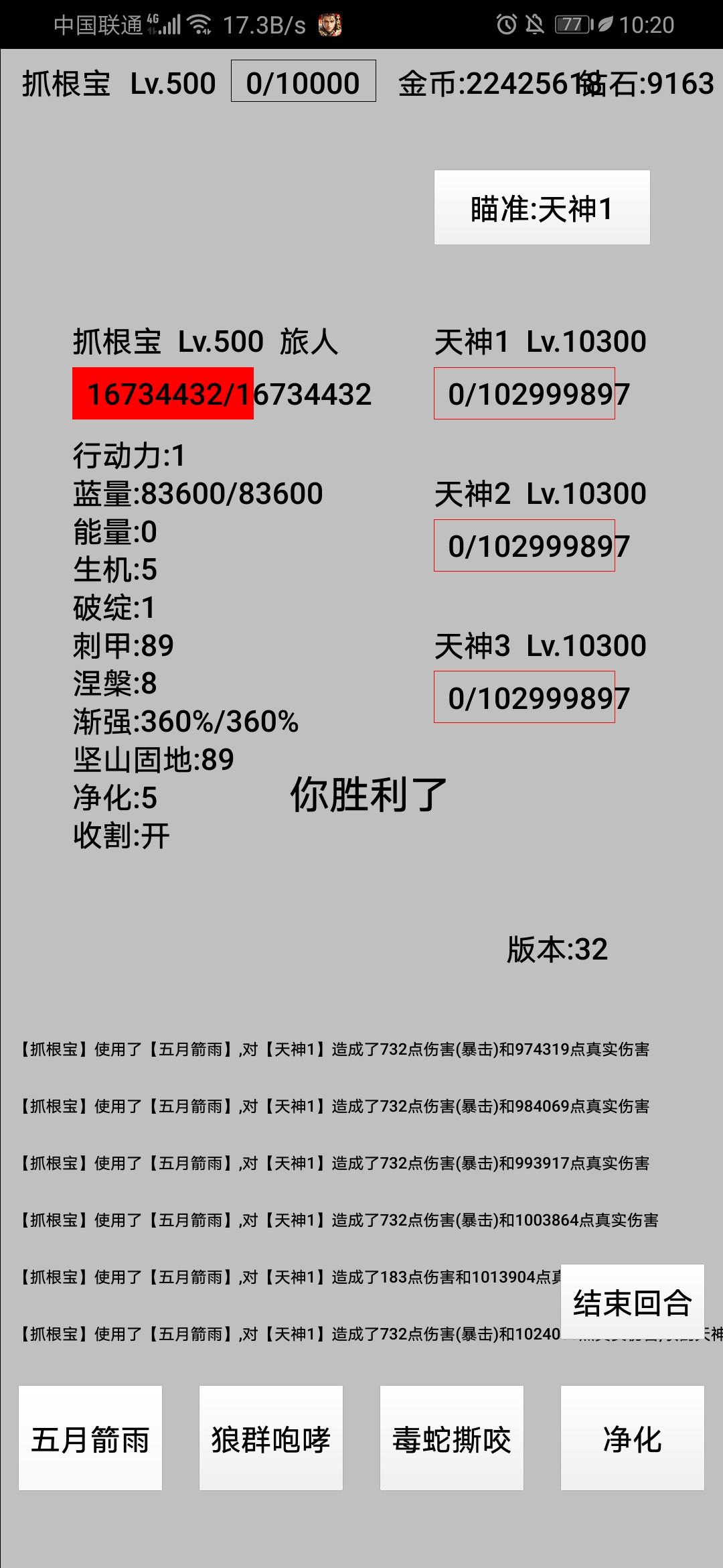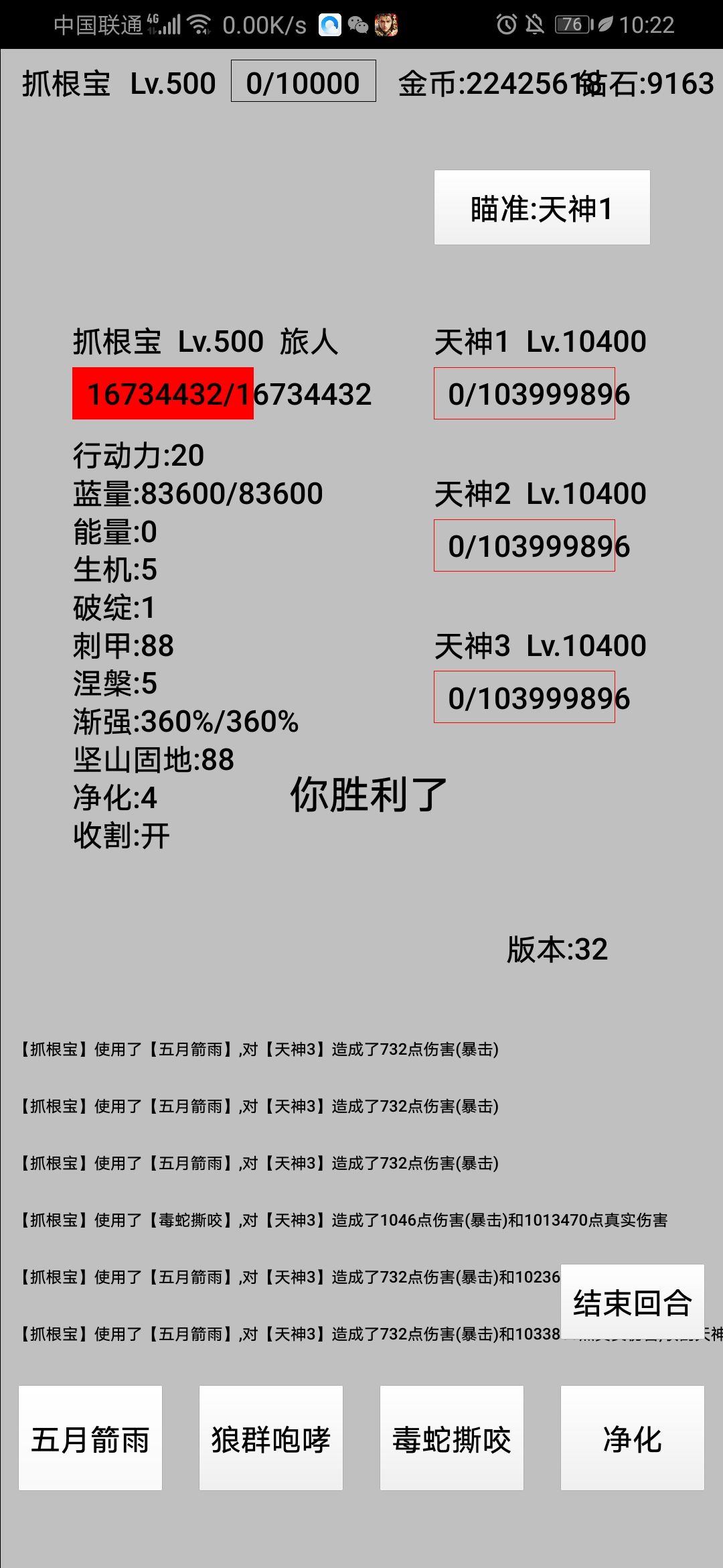 32版打天神,由于比较刮痧,思路破绽→真伤,旅人自带反甲坚固适应力,符文魔神证加持庞大的属性和盾→双防和血量,还有生机,五级最好。