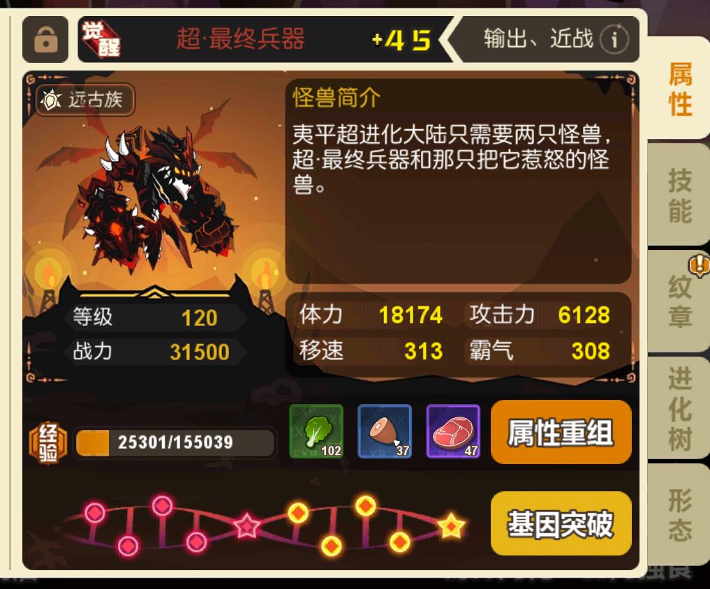 这个游戏,基因,一个基因+几十点属性,这多么?一个纹章,加几百点属性,后期1000多,这多么?这对后期动则几万体,几万攻的怪,提升真的大么?是主要原因么?并不是,这个游戏最主要的是物种同化!和等级!同化和等级高,才是真的高,不要总想着前期就如何如何,有很多新生都是前期不如紫怪的存在,后期却是主流,原因就在这,同样的怪,你100级,10级纹章,+45,但是同化低,假设,你1w体,1w攻,而人家同化高等级高的,120级,+30,纹章8级,就2w体,2w攻,你用头比么?所以不要有基因就用,基因加的并不多,而且基因中的大基因,加成才多,要加就加个整数,+5+10+15+20,不要老是+9+8+13+23,有什么用?