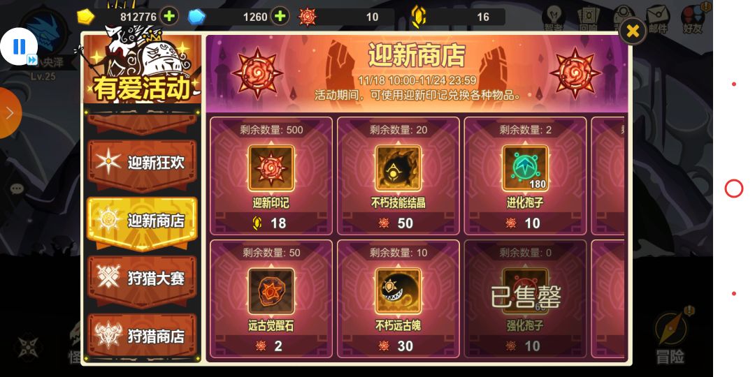 前期金币很缺,所以可以选择在迎新商店里。换取10印记的金币,10印记的金币,在前期就完全够用了,剩下的印记,要换取“进化孢子”和“远古觉醒石”,这是所有新手前期必须得,进化孢子,用来进化主角和选的其他几个怪,远古觉醒石,最好能换出50个,这样在前期资源都给主角的情况下,主角能快速到达65级,在觉醒石足够的情况下,能够快速觉醒,这在前期的开荒情况下,可以抢占先机。