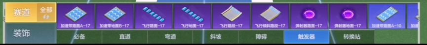 起点终点后面会显示17或者10,按照目前测试来看应该是赛道的长度。这个可以随心挑选搭配。然后就是每个赛道“零件”了。有直道弯道斜坡障碍等,同样很多赛道后面都有长度表示10或者17。重点说一下障碍和触发器这两个东西,这两个东西在设计地图中可以让你的地图更加有趣。