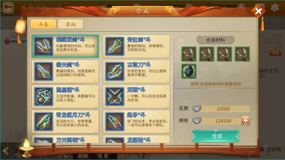 在新版本将支持所有【普】绿色品质装备合成为【斗】蓝色品质。我们也会在游戏开放到一定进程解锁【神】紫色与【尊】橙色品质装备的合成方式。