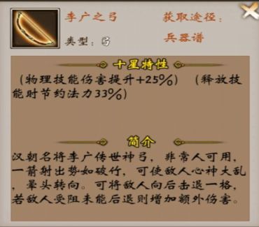 4.李广弓,这个应该是最被忽视的弓了,估计大多数玩家都没开启这个武器谱,毕竟元宝也不少,作用看起来也不大,但其实,它居然是战三输出最高的弓。特性:击退增伤66%,使用武力技能伤害提高。大部分玩家只知道后者,然后把李广弓给孙尚香,玩武力技能增伤用的,但实际上,前者的增伤才是重点,配合奋战象,直接增伤1倍以上,也就是比双倍伤害还高的伤害。具体怎么玩,参考之前的奋战象的攻略,这里就不多说了。