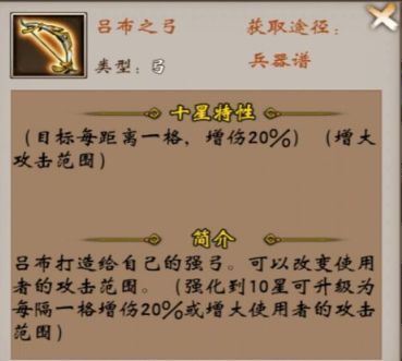 2.吕布弓,武器谱的神弓,最早就可以被平民玩家所得,是平民第一宝弓。特性是每距离一格增伤20%,最大距离3格,所以最大伤害是60%的增伤,优点:输出很高,近乎白嫖。缺点:跟射日一样,不防近身,黄忠需要带青龙甲。吕布弓的单体输出很高,前期可以给张郃,打副本用的,等收了黄忠可以给黄忠,只是黄忠没有八面或者没雨箭攻击范围,需要穿吕布甲,少了黄金甲的攻击加成,后期等收了夏侯渊,也可以给夏侯渊,利用夏侯渊的高移动和步伤,奋战,打出吕布弓的最大伤害。