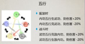 除了武艺类型、武器武学的区别外,所以武学都附有五行属性,五行属性在配装及战斗时会产生效果,配装时内功五行生武功,伤害会增加20%,反之内功五行克武功,伤害减少20%。战斗时,武功五行克敌方内功五行,则伤害增加20%,反之武功五行生敌方内功,伤害减少20%。是不是已经糊涂了呢~快去补一补五行知识吧~当然,游戏中也还有少量武学属于无行,区别于五行之外,不受上面规则的约束。