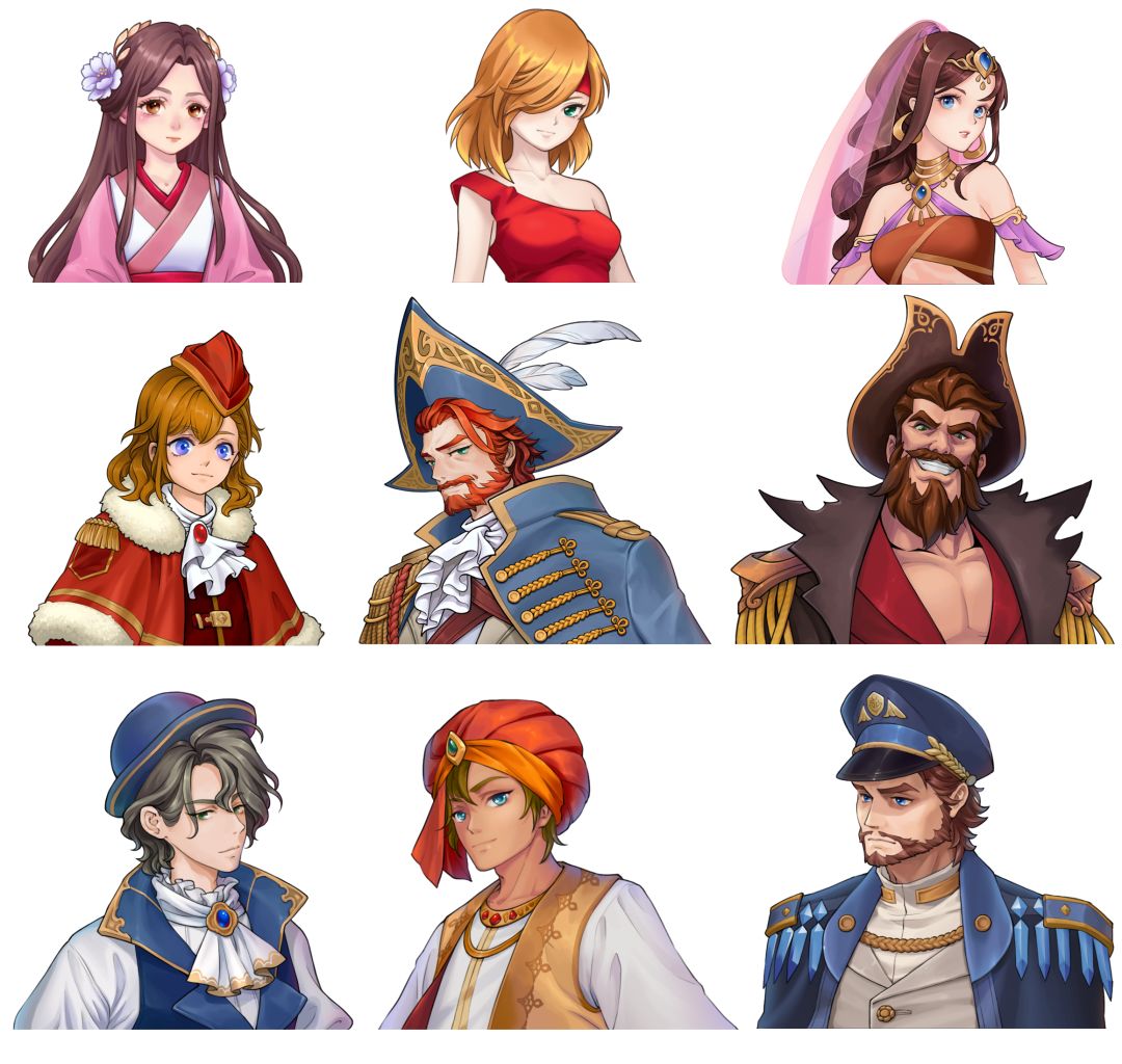 除了游戏玩法和内容和优化,我们也绘制了一批新的立绘风NPC形象,先给航海家们看看,目前还没有全部在游戏中上线,上面大家看到的立绘剪影,后续会进行替换。