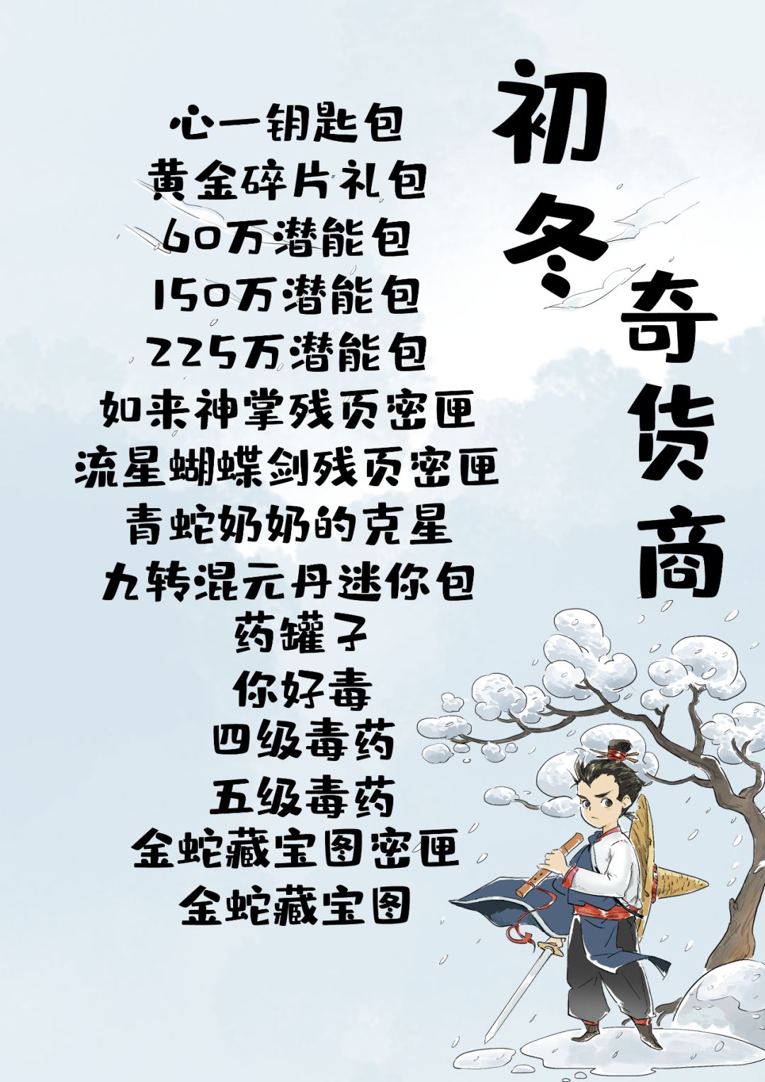 持有一定量【初冬鱼宝】的侠士可前往偶货商处兑换实用道具,兑换数量为活动期间内总数量(非单日数量)。