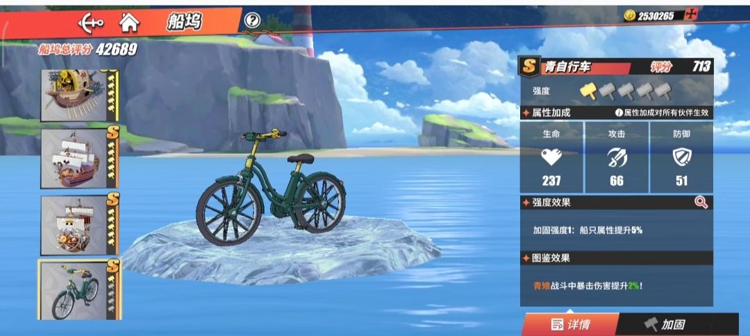 青雉自行车是一艘S船(自行车),特性是增加青雉2%的爆伤,作为一艘S船,升满所加的战力无疑是很高的。