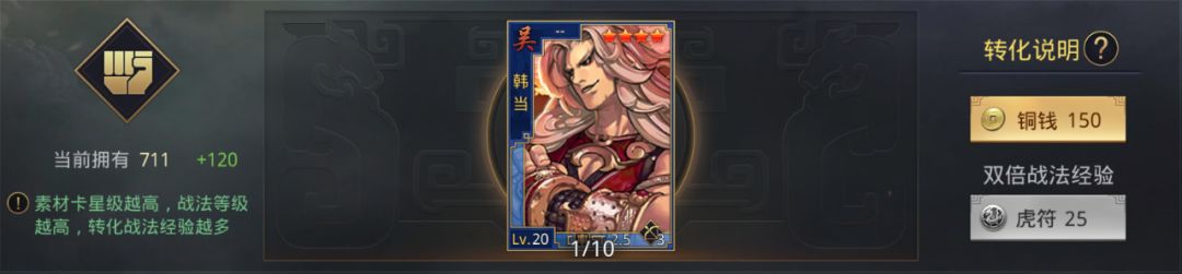 2.不暴击也不使用双倍转换的话,一张满红3星武将可以转换为48战法经验,一张满红四星可以转换为120战法经验,一张满红五星可以转化为288战法经验。