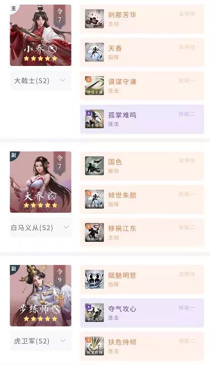由于步练师的加入,妹妹队的防御与智力有了极大提升,配合小乔与大乔的自带技能,对连击队伍和主动队伍都具备适应能力,虽然飞琼队整体输出能力一般,但承伤和续航在S3堪称顶尖,有着“众生平等”的效果。