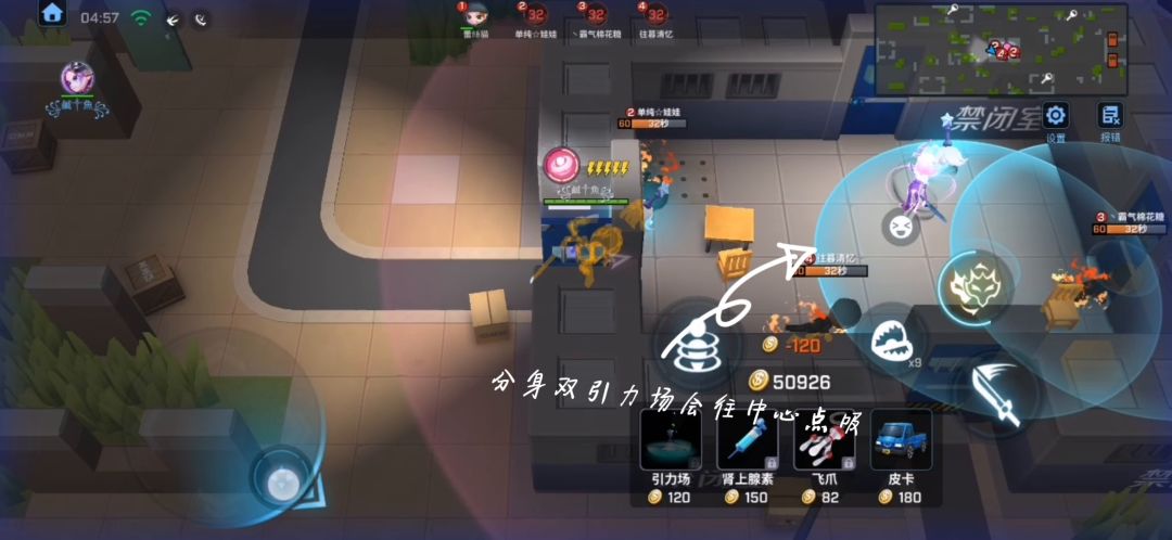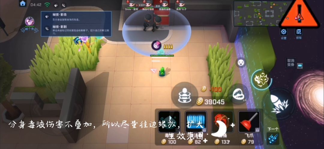 收割被标记玩家的影子,提升影法能力。(只计算武器击杀和道具卡击杀,队友击杀时标记消失但不计算被动,夹子也不计算被动,无论是你放的还是原有的)影步(2层):在草丛中逐渐加速。(大致上相当于一个疾跑,具体多快不知道,懒得测了)王者以下尽量走草丛,毕竟一局持续不了多长时间,可能影戏都没激活就结束了。王者以上看情况进,毕竟王者局人均越共,鬼知道你要进的草丛里蹲着几个大汉……影戏(6层):分身可复制道具卡。有数量限制的道具卡(治疗球、追踪雷、狗)超出限制会移除最早释放的道具卡(这一栏仅对角色本身做讲解,可复制的道具卡衍生的效果会放在第二栏里讲)范围类道具卡(包括但不限于手雷,包,阻挡,眼等道具卡)如下方视频所示,在瞄准时会有两个以本体和分身为圆心的圆形范围,其中的两个蓝色圆即为伤害范围。