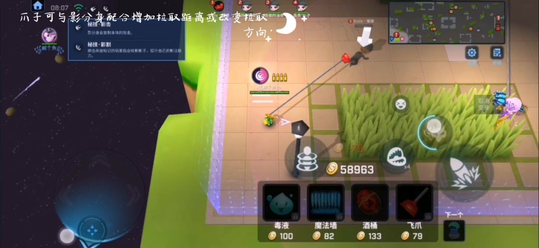 指向性道具卡(包括但不限于飞爪,酒桶)本体和分身瞄准时会有两个条形范围,这两个条形范围永远相交且有一个交点。视频展示跟飞爪搭配放一起了