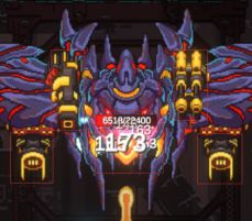 boss蝠诡,受击部位分主炮,左右肩炮,左右翼炮。主炮,发射激光束;左右肩炮,发射蓝色雷球弹(扇形向下缓慢投射),粉色扩散弹(核心缓慢下落后碎片向外分散);左右翼炮,发射粉色喷射弹(接近全屏攻击,仅剩一片扇形空隙),紫色散射弹(蝌蚪形状,扇形向下投射),此外,不受击的主体还会发射粉色激光及追踪火箭弹。