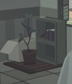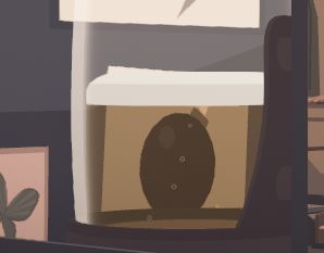 在新家右边的墙上还挂着一幅画,应该是敲钟的提示。这里还有主角的化身:一盆大盆栽。在书架上还有个小盆栽,和之前的父亲小盆栽主角大盆栽的规格一样,只有叶子而且是深红色花盆的,所以这可能暗指这个地方新添了一个小朋友。