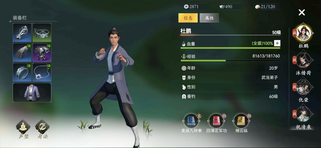 刚都打穿了,人物刚刚全体五十级,根据论坛大侠们发的藏宝图和箱子也全部找齐,图和主线也都上交了。大概肝了13天左右吧,说说看法吧。 怪物难度偏高,同级根本都不好打,不过也能玩,反正就是有点难,但肝点弄武器装备和武功也磨的过去。 采集确实慢,如果没有高级采集药丸,我真不想等那么久。 到五十级我才合成两件紫装,一件20级的,一件40级的,蓝色都很少很少,45级以后推荐去刷废弃庄园的府卫,掉40级蓝色模具,概率还挺大。 阅历不够用,钱也不够用,啥都不够,我已经很肝了,我基本一天最少5-10小时在线,所有任务刷完,还是穷的一比,武功秘籍和装备都挺贵。 还有紫装蓝装和绿装那完全不是一个档次,只要你有装备,武功,基本啥也不怕,横行无忌,没装备,老老实实磨吧。 飞镖和剑伤害挺可观。 我玩的武当拳,门派武功不比外面的太极拳差甚至厉害一点。 祝清泉用的剑,学了幻相剑,她目前是我伤害最高的,普攻打出过8000多的暴击。 燕叙和姜储凝我玩的镖。镖卡在没武功,后来才知道特么应该学笛,来提升武学再来学高级镖法。燕叙是啥都能学,刀枪剑棍啥的,有个大神发过每个人的资质的,燕叙都是1.1。