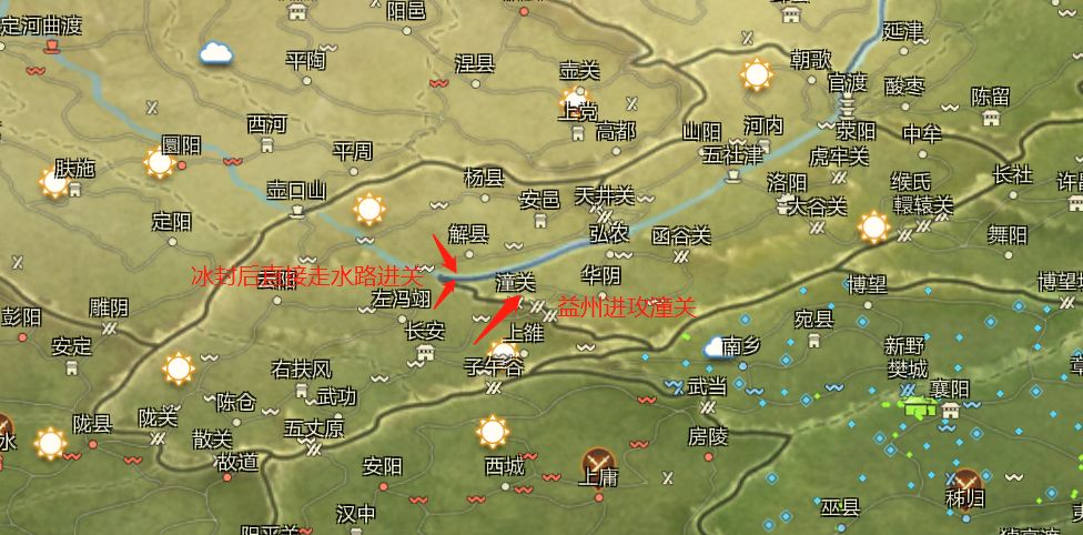 在冰冻自然灾害触发后,河面结冰,可以完美的绕开潼关关口.直接从侧面派小波军团突袭进攻.配合着正面主力的僵持拉扯,可以直接改变整个战局的形式。从而起到意想不到的效果。
