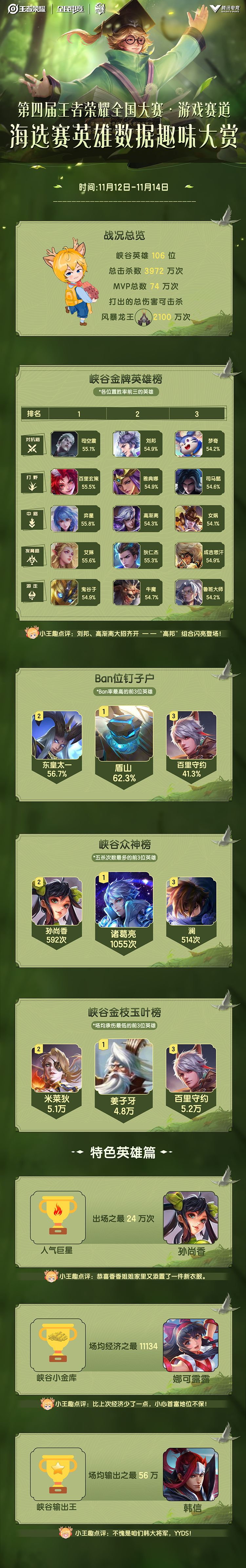 咻~,本次王者荣耀全国大赛游戏赛道英雄趣味数据来也!