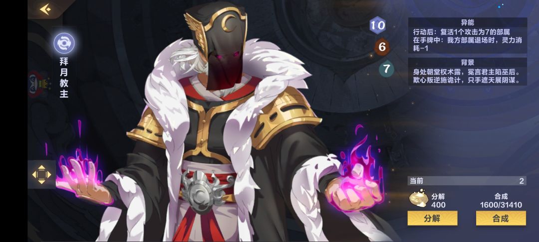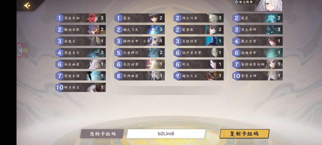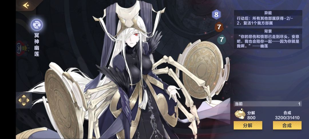 接下来是阴体系的核心成员,白幽莲,黑幽莲,族长,女神,拜月,这几位不用说了,新版我们迎来了阴系核心成员新宠,夙玉!有了她的加入,这一套体系将形成一套完美的闭环,我简单的讲一下,首先夙玉召唤登场,此时如果拜月,黑幽莲,女神,这几个任意一个在坟地,那么夙玉退场,随便入手哪张卡都是血赚!入手拜月,上场行动后复活7攻部署,可以复活族长,黑幽莲,夙玉,黑幽莲每回合复活一个部署,族长刷大,夙玉可以形成下一轮循环,白幽莲如果在手牌还可以给他们全体打复活,真的不要太无敌。。。😜😜