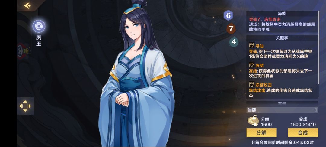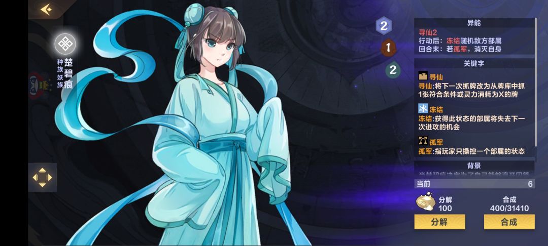 而楚碧痕是寻仙2,也是非常重要的,因为我们2费有什么?砍头,飞矢,汲灵,静谧安歇,全是重要的牌,关键的时候汲灵保命,回收墓地的飞矢,黑莲圣火,砍头哥,这些都是重要的关键牌。另外,楚碧痕还有一项异能,就是行动后能冻结敌方一个随机部署,这点也能极大的增加我们在前期的存活几率,保证我们不被快攻冲死。