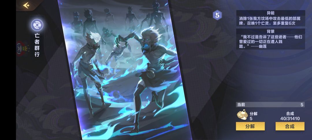 王陵和亡者这两张卡也是为了前期抗快的卡,王陵这张卡用的效果还是不错的配合赤鬼王能召唤3个44亡灵,强度是可以的。亡者这张卡用的时候一定要注意,用之前一定先好好看看我们的墓地有哪些低攻部署,有多少个,一定注意不要把核心部署给洗了,比如小雪白幽莲。