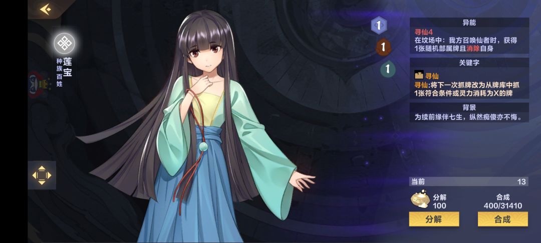 首先飞矢和圣火是上限阴的核心卡,但是旧版因为没有寻仙定向检索,所以想要顺利入手这两张卡只能凭运气,但是新版有了寻仙这套新的机制,所以我们要加入莲宝和楚碧痕这两张卡。